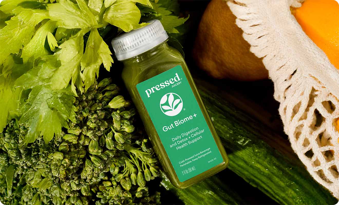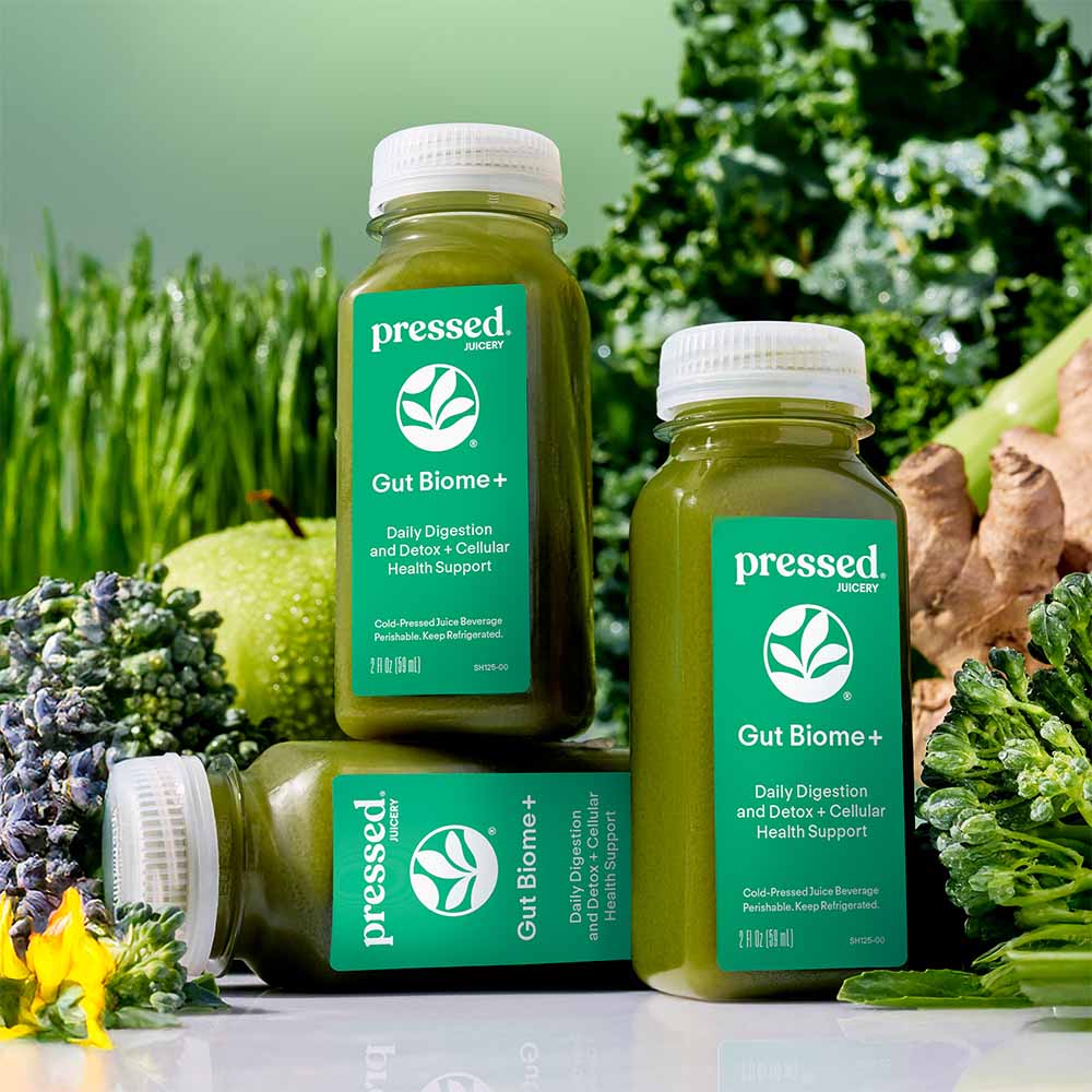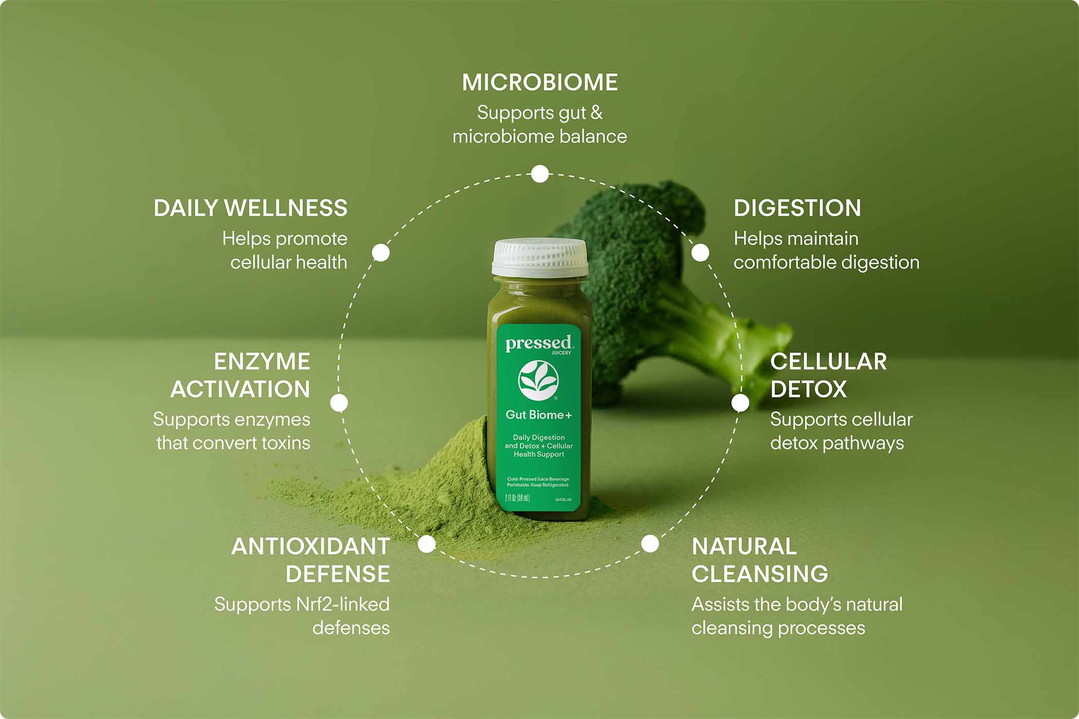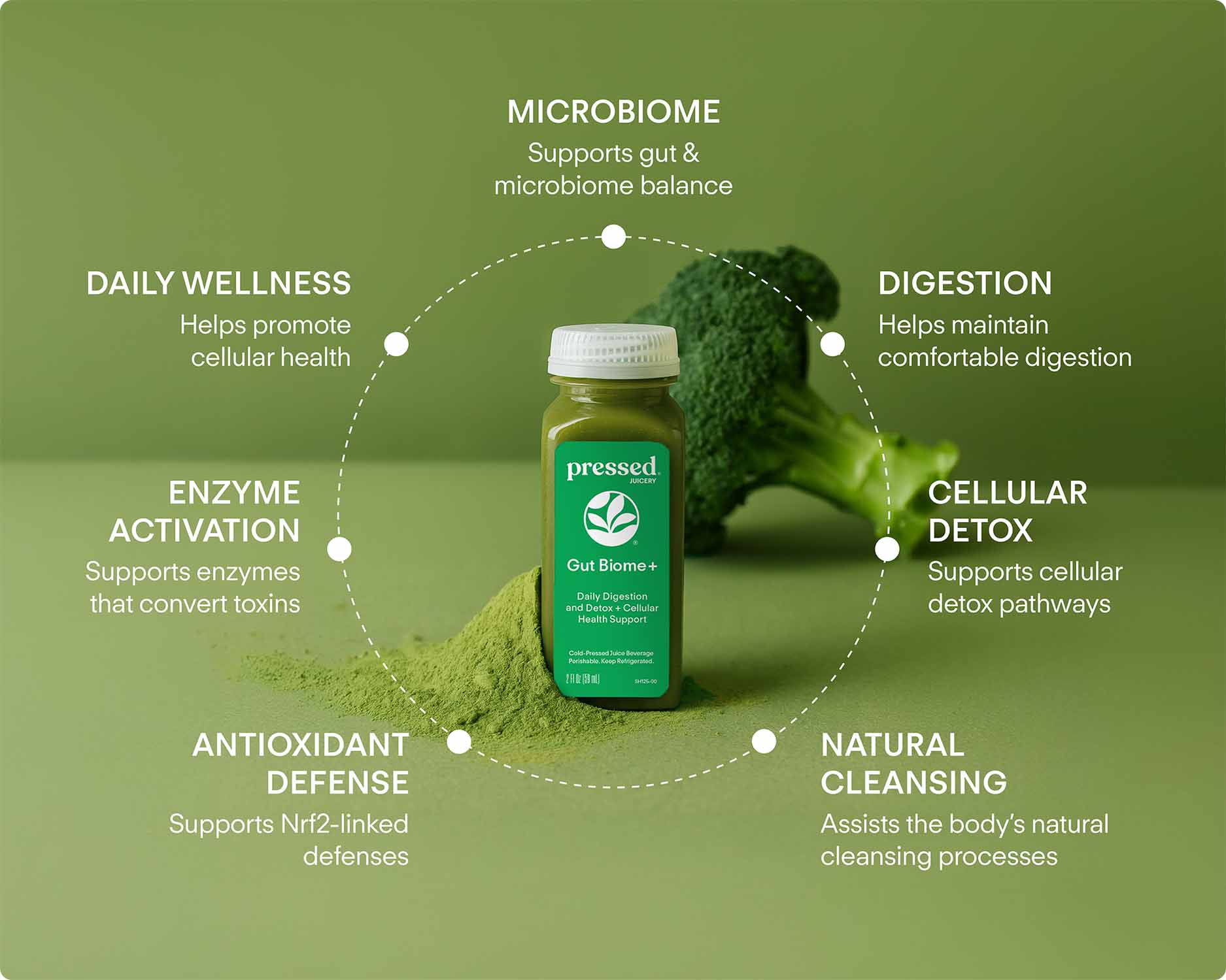 Gut Biome+ is a triple-action shot powered by sulforaphane, probiotics, and prebiotic fiber to detox, rebalance, and glow from within.
